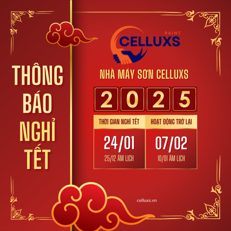 Nhà máy Sơn CELLUXS xin chân thành cảm ơn sự tin tưởng và ủng hộ của quý vị trong suốt thời gian qua. Nhân dịp Tết Nguyên Đán 2025, chúng tôi xin thông báo lịch nghỉ lễ như sau: